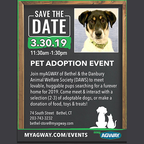 Join DAWS and AGWAY on Saturday, March 30th from 11:30am-1:30pm for a fun-filled adoption event. Meet some of our adoptable animals and stock up on your favorite pet supplies!